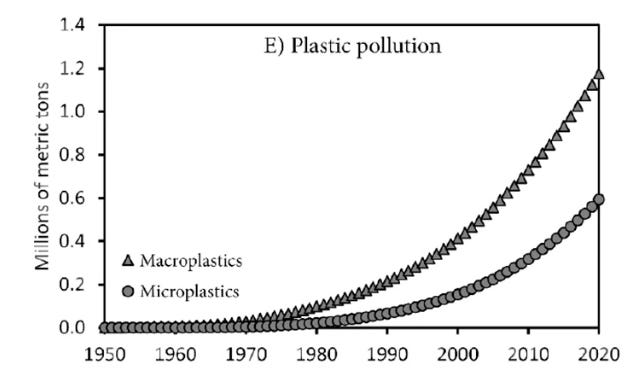 Plastic pollution from packaging, synthetic textiles, buildings, construction, industrial and shipping spills, waste water effluent, tire wear, fishing gear, etc.