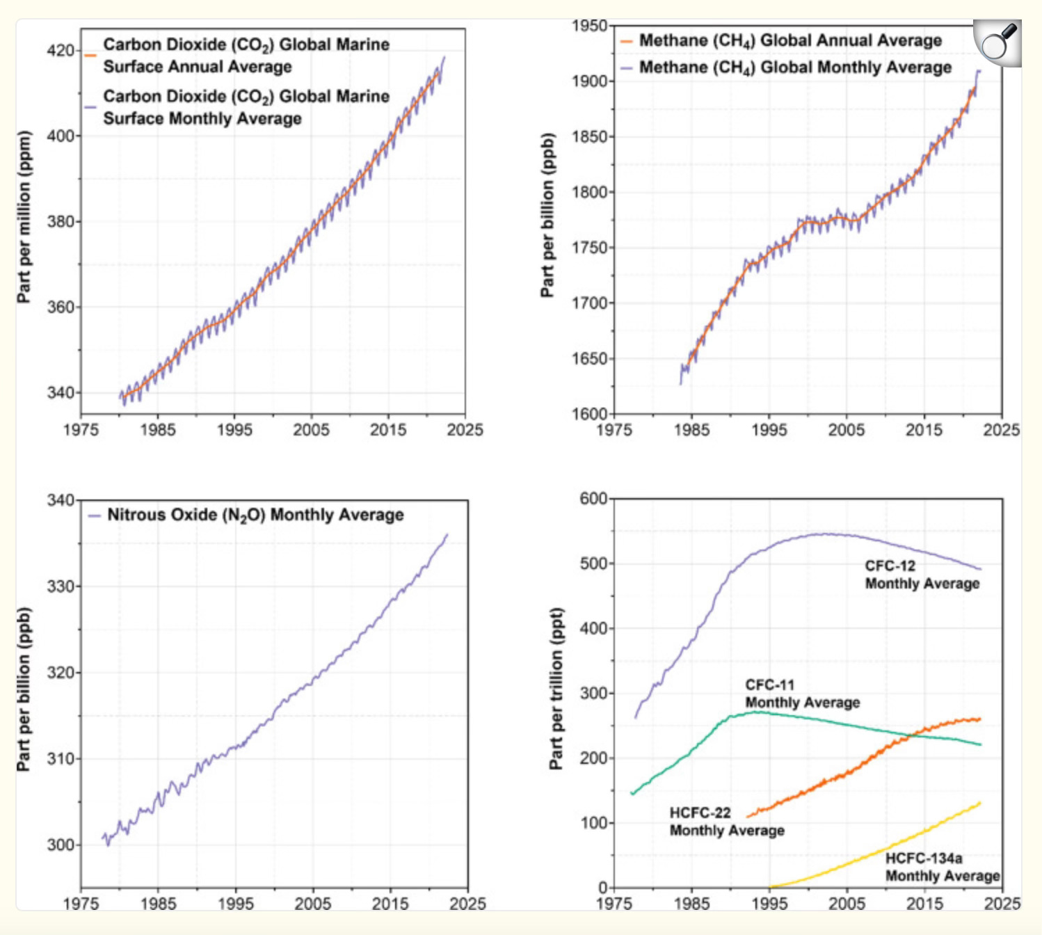 Greenhouse gas pollution from industrialized civilization causing seawater warming, acidification, and reduced oxygen.