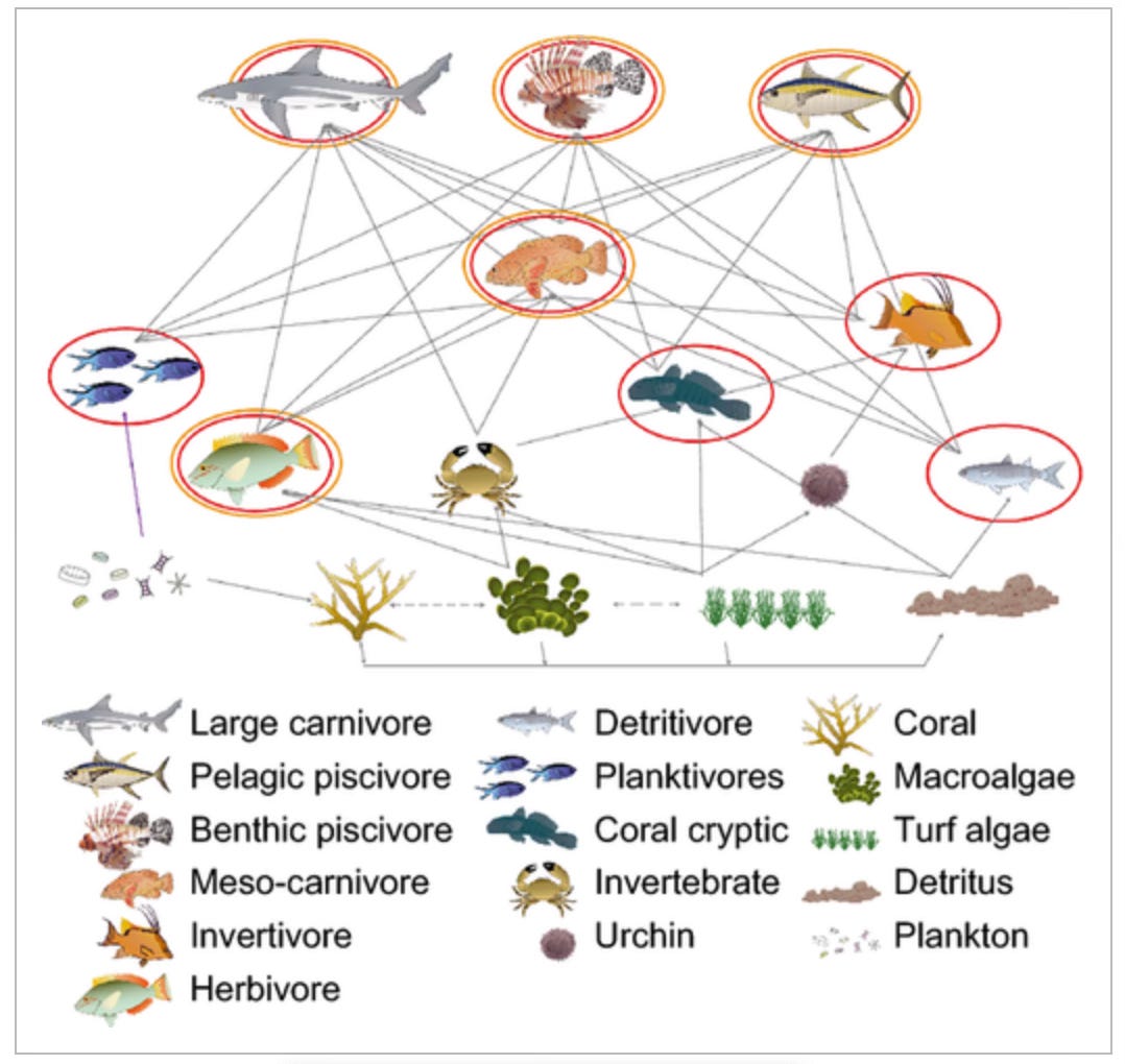 From personal experience in Hawaii, I can relate how overfishing affects coral reefs, which indisputably are among the most amazing living communities on Earth. Removal of large numbers of algae-feeding fish, such as parrotfish, allow algae to proliferate and smother coral organisms. This, combined with land-based pollution from coastal development, agricultural lands, human waste, etc., and the effects of climate change (ocean acidification and warming) conspires to degrade and ultimately destroy coral reefs.