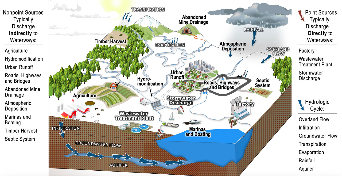Sewage, wastewater, and “runoff” pollution from houses, transportation, industry, agriculture, livestock production, etc.